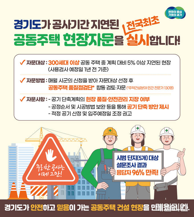 [데일리엔뉴스 이종성 기자] 경기도가 공사 기간이 지연된 공동주택 현장에 자문단을 파견하는 사업을 전국 최초로 추진한다. 공사 기간을 맞추기 위해 부실시공을 강행하면서 나타나는 품질·안전 문제를 예방하기 위해서다.