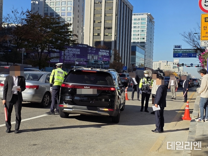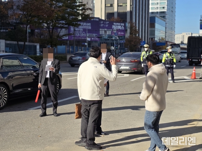 출구 앞 우회전 차로에는 안내요원이 배치돼 일반 차량의 진입이 제한됐고, VIP 차량 이동 동선 확보를 이유로 통제가 이어졌다.