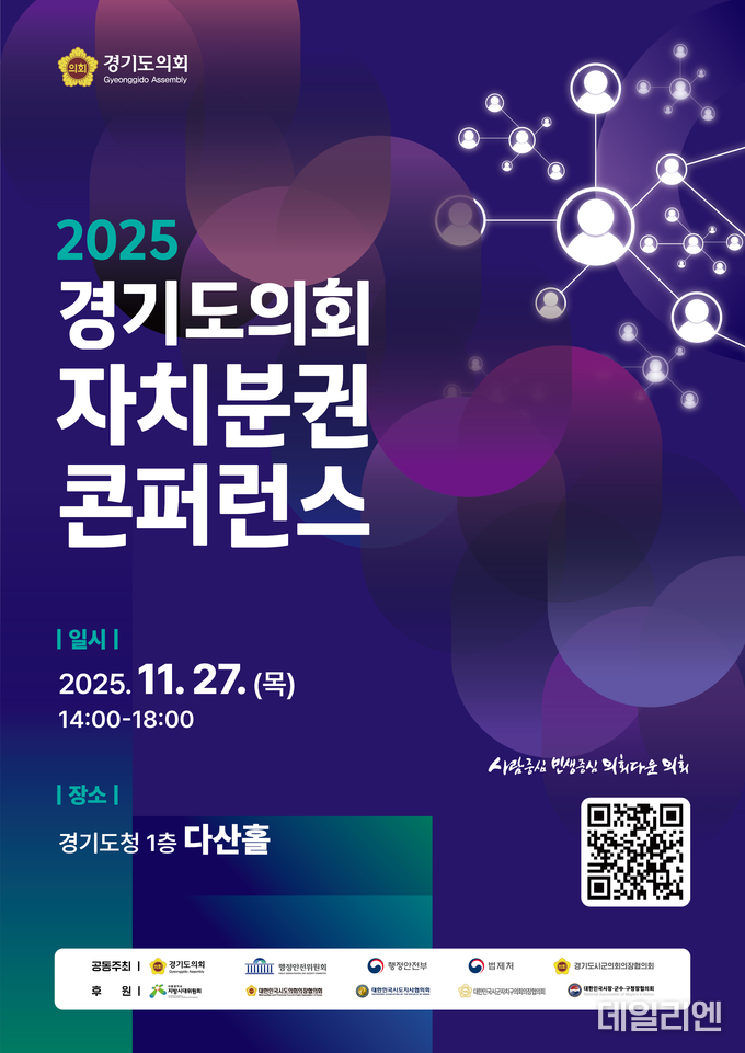 [데일리엔뉴스 이종성 기자] 경기도의회가 전국 최초로 광역·기초의회가 함께하는 ‘2025 경기도의회 자치분권 콘퍼런스’를 27일 경기도청 다산홀에서 개최한다. 자치분권 실현에 대한 사회적 공감대를 넓히고 지방자치의 미래 방향을 논의하기 위한 자리다.