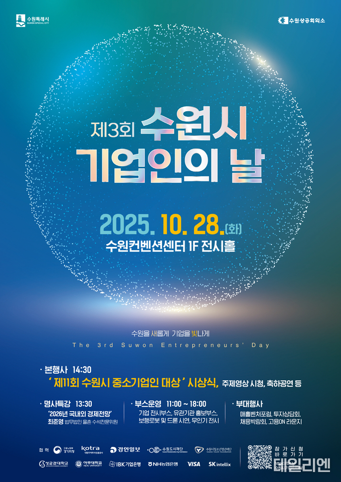 행사는 ‘기업이 빚어낸 수원의 시간’을 주제로 한 영상 상영을 시작으로 이재준 수원특례시장의 환영사, ‘제11회 수원시 중소기업인대상’ 시상식으로 이어진다. 본행사에 앞서 최준영 법무법인 율촌 수석전문위원이 ‘2026년 국내외 경제전망’을 주제로 특강을 진행한다.
