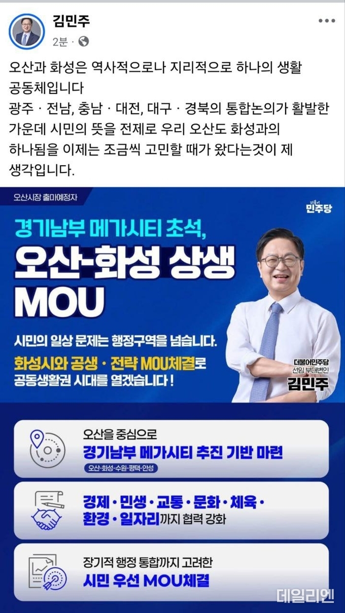[데일리엔뉴스 이종성 기자] 김민주 오산시장 출마예정자는 24일 자신의 SNS를 통해 오산과 화성이 역사적·지리적으로 하나의 생활공동체라고 밝히며 상생 협력 필요성을 제기했다.