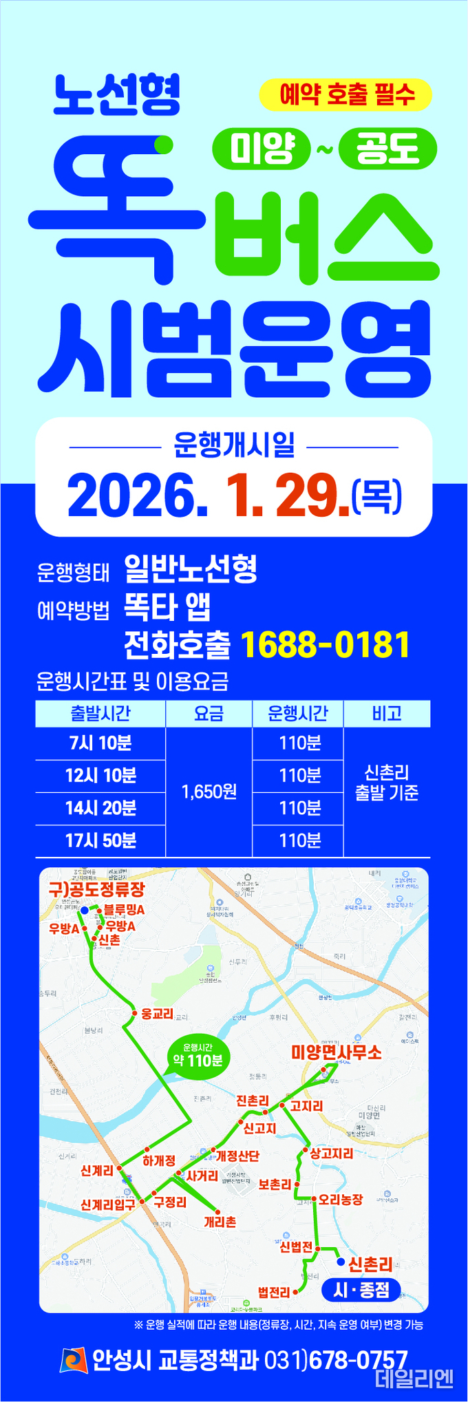 [데일리엔뉴스 이승준 기자] 안성시가 1월 29일부터 미양면과 공도읍을 직접 연결하는 노선형 똑버스 정식 운행을 시작하며, 지역 간 단절된 교통 불편 해소에 나섰다.