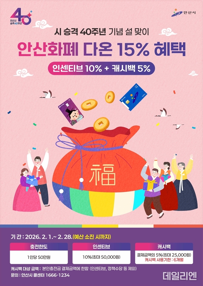 [데일리엔뉴스 이종성 기자] 안산시는 시 승격 40주년을 기념해 2월 한 달간 지역화폐 ‘다온’ 이용자에게 최대 15%의 소비 혜택을 제공한다.