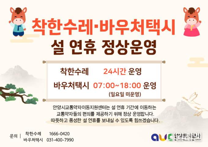 안양시는 2월 14일부터 18일까지 닷새간 ‘착한수레’와 ‘바우처택시’를 정상 운행한다고 11일 밝혔다. 명절 기간 병원 진료와 등·하교, 출·퇴근, 가족 방문 등 필수 이동 수요에 대응하기 위한 조치다.