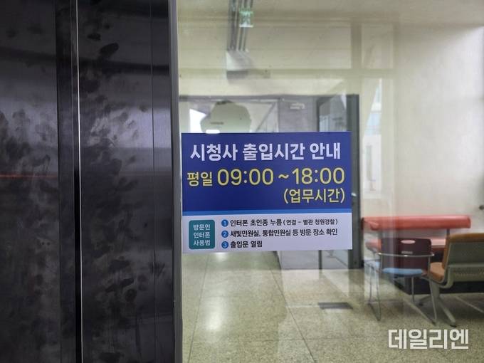 또 수원시청과 의회를 잇는 연결통로 출입문에는 ‘시청사 출입시간 안내’ 안내문이 부착돼 있다. 안내문에는 평일 오전 9시부터 오후 6시까지 업무시간이 표시돼 있으며 방문인은 인터폰 호출과 방문 장소 확인 절차를 거쳐 출입문이 열리는 방식으로 안내돼 있다.