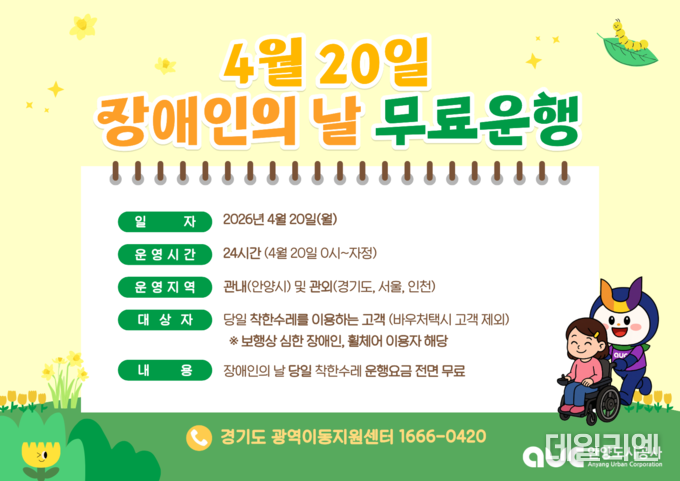 시 관계자는 “장애인의 날을 맞아 준비한 이번 무료 운행이 이동에 제약을 받는 분들에게 작은 응원이 되길 바란다”며 “앞으로도 교통 약자가 안전하고 편리하게 이동할 수 있도록 안정적인 서비스 제공에 힘쓰겠다”고 말했다.