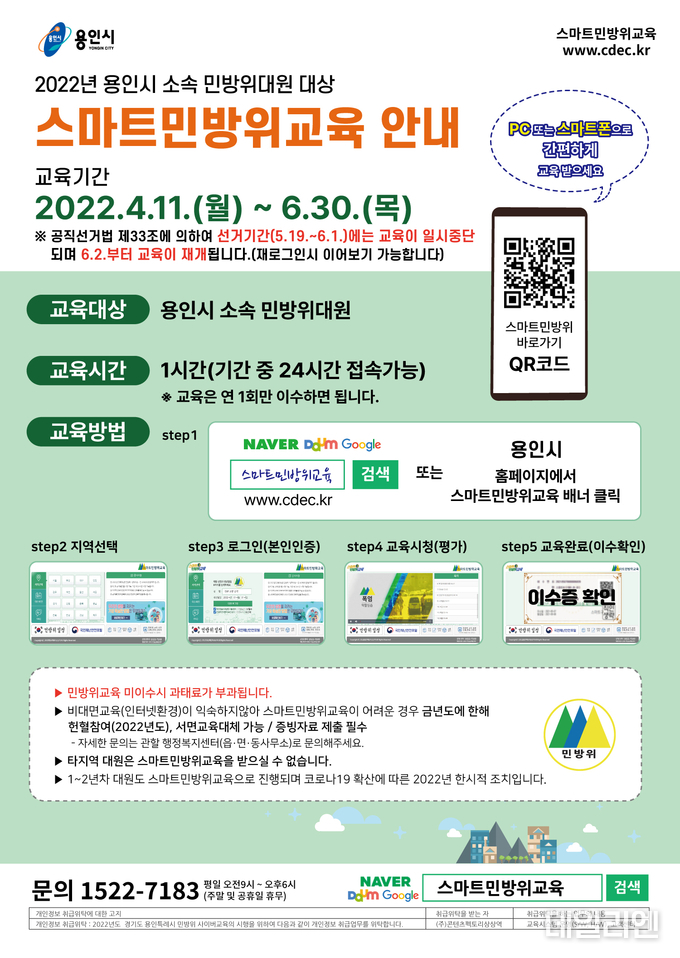 용인시는 오는 6월 30일까지 ‘2022년 민방위 사이버 교육’을 실시한다고 11일 밝혔다.
