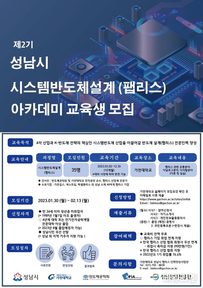 반도체 분야의 설계 전문인력을 양성해 4차산업 현장에 투입하고자 성남시와 가천대학교, 한국팹리스산업협회, 반도체공학회가 협력해 이론과 실습 교육, 취업 연계까지 지원하는 교육 과정이다.