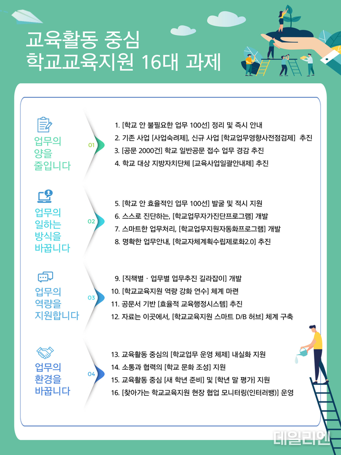 학교 직책별·업무별 업무 추진에 실질적 도움을 주는 ▲교감, 부장교사, 신규교사 업무 추진 길라잡이를 개발하고 ▲학교교육지원 역량 강화 연수 체계를 마련한다. 공문서 기반 효율적 교육행정시스템을 추진해 ▲공문생산 질적 개선 ▲공문 관련 연수 콘텐츠 ▲K-에듀파인 업무처리 효율화를 지원한다.