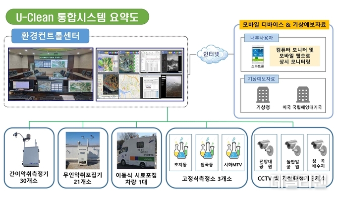 U-Clean 통합시스템은 ▲고정식 측정소 ▲폐쇄회로(CC)TV ▲악취측정 센서 ▲무인 악취 포집기 ▲이동식 악취측정 차량 등을 갖추고 있다. 이를 통해 실시간으로 악취 영향 분석이 가능할 뿐 아니라, 예측모델링, 역추적모델링 기능을 갖추고 있어 민원 발생 시 악취 발생 주변 지역의 신속한 점검 등 체계적인 대응이 가능하다는 이점이 있다.