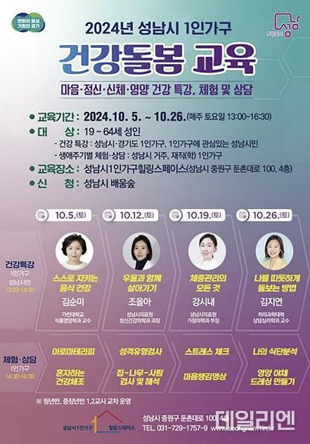 이번 프로그램은 혼자 사는 시민들의 건강 챙기기를 지원하기 위해 기획돼 ▲19일 강시내 성남시의료원 가정의학과 부장의 ‘체중 관리의 모든 것’ ▲26일 김지연 분당차병원 차심리상담센터장의 ‘나를 따뜻하게 돌보는 방법’ 등의 순으로 특강을 진행한다.