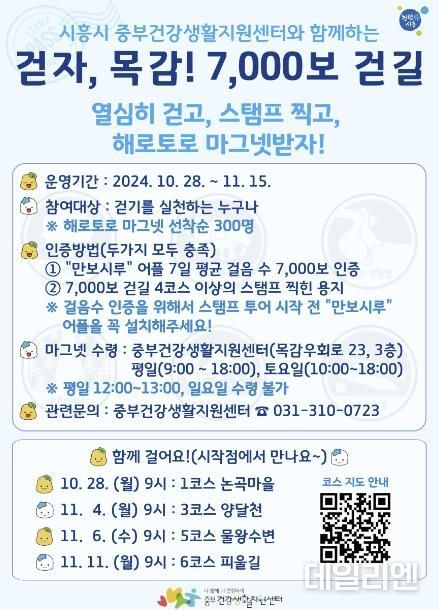 [데일리엔뉴스 이종성 기자] 시흥시 중부건강생활지원센터는 시민들의 걷기 생활을 장려하고, 지역 내 걷기 좋은 코스를 홍보하기 위해 ‘걷자, 목감! 7천 보 걷길’ 스탬프 투어를 10월 28일부터 11월 15일까지 3주간 진행한다.
