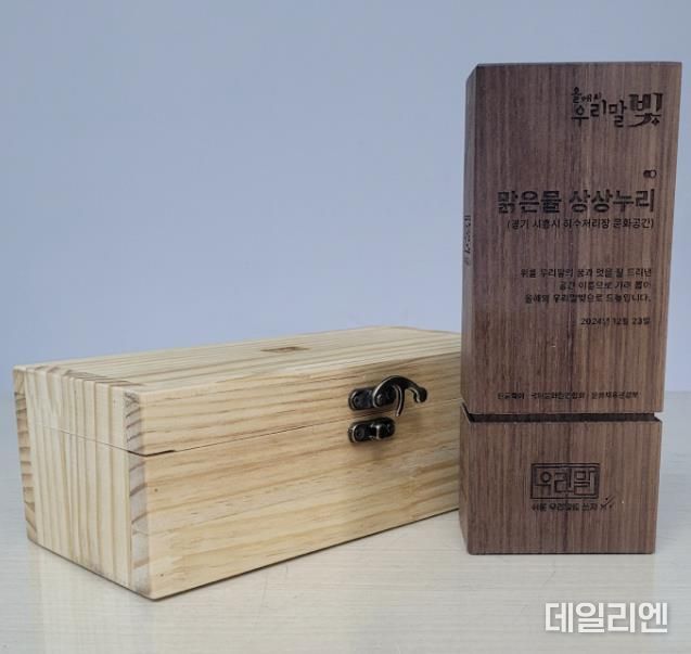 [데일리엔뉴스 이종성 기자] 시흥시의 ‘맑은물상상누리’가 지난 23일 서울 중구 새문안로에 있는 한글학회 강당에서 열린 ‘올해의 우리말빛 보람 수여식’에서 ‘올해의 우리말빛 공간 이름’ 부문에 선정돼 인증패를 받았다.