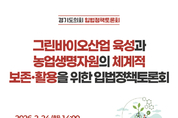 [데일리엔뉴스 이종성 기자] 경기도의회가 그린바이오산업 육성과 농업생명자원의 체계적 보존·활용 방안을 논의하는 입법정책토론회를 연다. 도의회는 오는 2월 24일 오후 2시 연천군 종합복지관 3층 소강당에서 「그린바이오산업 육성과 농업생명자원의 체계적 보존·활용을 위한 입법정책토론회」를 개최한다고 19일 밝혔다. 이번 토론회는 농정해양위원회 윤종영 부위원장이 좌장을 맡아 발제와 토론을 진행하고, 제도 개선 방향에 대한 의견을 종합·정리할 예정이다. 행사는 연천군이 경기도 그린바이오산업 북부 육성지구로 지정된 이후 농업생명자원의 보존·관리 체계와 산업적 활용 방안을 종합적으로 점검하기 위해 마련됐다. 발제는 최춘환 경기도경제과학진흥원 바이오연구개발팀 책임연구원과 최익영 강원대학교 스마트팜농산업학과 교수가 맡는다. 두 발제자는 농업생명자원의 산업화 가능성과 정책 지원 방향을 제시할 계획이다. 이어지는 토론에는 그린바이오산업 기업체 대표를 비롯해 엄기만 경기도 바이오산업과장, 황인순 경기도 친환경농업과장, 정윤경 경기도농업기술원 선인장다육식물연구소장, 이현주 연천군 경제교통과장이 참여한다. 참석자들은 농업생명자원 보존과 산업적 활용을 위한 정책 과제를 다각도로 논의