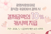 [데일리엔뉴스 이종성 기자] 광명시가 5월 한 달간 관내 음식점과 카페에서 광명사랑화폐로 결제한 시민에게 결제액의 10%를 돌려주는 캐시백 지원사업을 시행한다. 광명시는 가정의 달을 맞아 5월 1일부터 한 달 동안 ‘가족 외식비 캐시백 지원사업’을 추진한다고 28일 밝혔다. 캐시백은 광명사랑화폐 가맹점 가운데 음식점과 카페에서 결제할 때 적용된다. 인센티브와 정책수당 결제분을 제외한 결제액의 10%가 광명사랑화폐로 즉시 환급된다. 지원 한도는 1인당 최대 1만 원이다. 다만 준비된 예산이 모두 소진되면 사업은 조기에 끝날 수 있다. 시는 고물가 속 외식 수요가 늘어나는 5월에 시민 가계 부담을 줄이고, 소비 침체로 어려움을 겪는 지역 소상공인을 지원하기 위해 이번 사업을 마련했다. 특히 광명사랑화폐 사용처가 한시적으로 확대되면서 캐시백 적용 가맹점도 늘어났다. 시는 오는 8월 31일까지 고유가 피해지원금 기준에 맞춰 연매출 30억 원 이하 업체까지 지역화폐 사용처를 넓힌 상태다. 지급된 캐시백은 지급일로부터 1개월 이내 사용해야 한다. 기간 안에 쓰지 않은 금액은 자동 소멸된다. 캐시백 지급 가능 가맹점은 경기지역화폐 앱에서 확인할 수 있다. 최혜민 광명시장