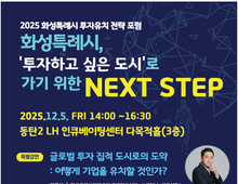 [데일리엔뉴스 유석주 기자] 화성특례시가 지속가능한 투자도시로의 도약을 위해 ‘2025 화성특례시 투자유치 전략 포럼’을 다음 달 5일 동탄2 인큐베이팅센터에서 개최한다. 시가 투자유치 전략을 주제로 단독 포럼을 여는 것은 이번이 처음이다. 포럼은 ‘투자하고 싶은 도시로 가기 위한 넥스트 스텝’을 부제로 화성특례시의 투자 성과를 점검하고 향후 경쟁력 확보 방안을 논의하기 위해 마련됐다. 행사는 특별강연과 전문가 포럼 순으로 진행된다. 특별강연에서는 김광석 한국경제산업연구원 경제연구실장이 글로벌 산업 변화 속에서 기업을 유치할 수 있는 전략을 제시한다. 이어 포럼 세션에서는 국토연구원 홍사흠 연구위원이 ‘초격차 도시를 향한 투자유치 패러다임 전환’을 주제로 발제하고 전문가 6명이 토론을 이어간다. 포럼은 기업인, 유관기관, 전문가, 공직자, 시민 등 누구나 참여할 수 있으며, 포스터 내 QR코드를 통해 사전 접수가 가능하다. 조한용 투자유치과장은 “이번 포럼은 기업이 체감할 수 있는 투자 환경을 만드는 실질적 해법을 모색하는 자리”라며 “전문가·기업·행정이 함께 ‘투자하고 싶은 도시, 화성’으로 도약하는 기반을 마련하겠다”고 말했다.