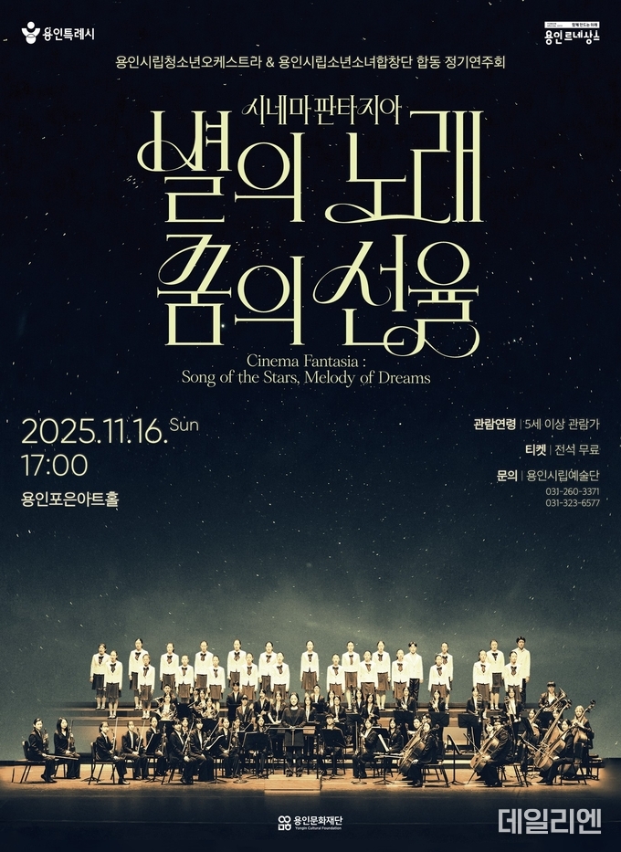 [데일리엔뉴스 이종성 기자] (재)용인문화재단(이사장 이상일)은 오는 11월 16일 용인포은아트홀에서 용인시립청소년오케스트라와 용인시립소년소녀합창단의 합동 정기연주회 ‘시네마 판타지아 : 별의 노래, 꿈의 선율’을 개최한다고 3일 밝혔다.