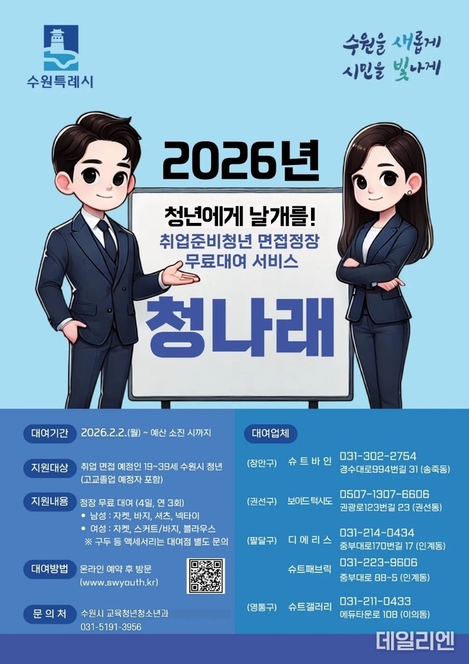 [데일리엔뉴스 이종성 기자] 수원특례시는 취업을 준비하는 청년을 대상으로 면접 정장을 무료로 대여하는 ‘청나래’ 사업을 2월 2일부터 운영한다고 밝혔다.