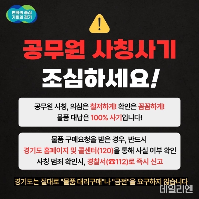 [데일리엔뉴스 이종성 기자] 경기도는 최근 잇따르는 공무원 사칭 사기로부터 중소기업과 소상공인을 보호하기 위해 법령 개정 건의와 자치경찰 협력체계 강화를 추진한다고 2일 밝혔다.