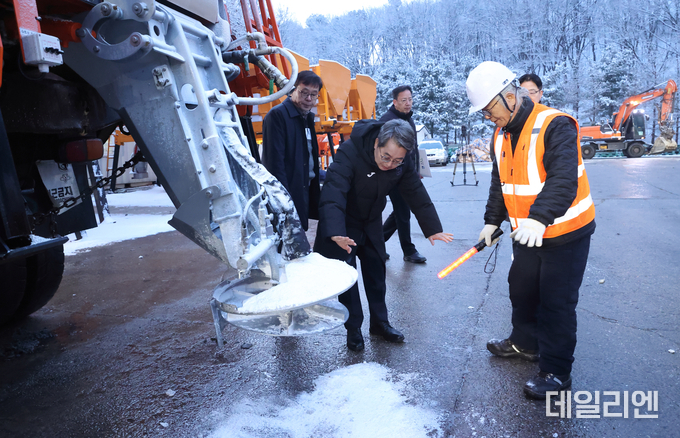 김 지사는 이날 오전 7시 30분 수원시 영통구 하동 수원 제설전진기지를 방문해 밤새 진행된 제설 작업 현황을 보고받고 작업자들을 격려했다.