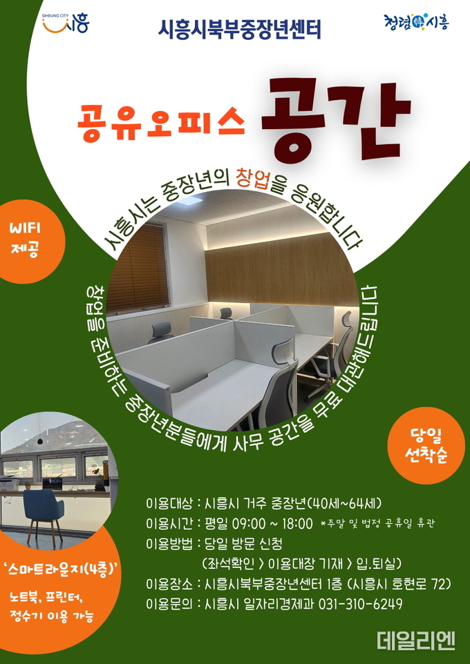 [데일리엔뉴스 이종성 기자] 시흥시는 중장년의 창업 준비와 경제활동 재개를 지원하기 위해 시흥시북부중장년센터에 공유오피스 ‘공간’을 조성하고 지난 2일부터 운영을 시작했다.