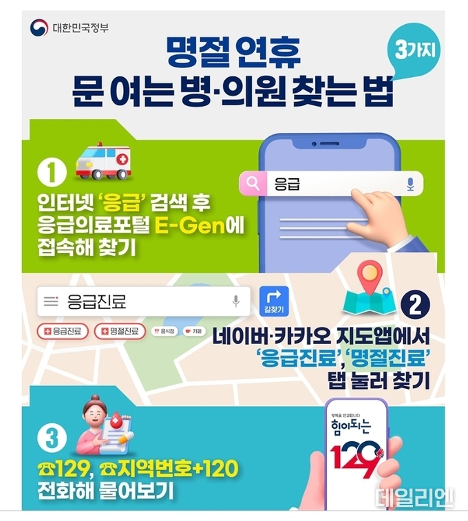 연휴기간 문 여는 의료기관·약국 정보는 129(보건복지콜센터), 120(시도 콜센터), 응급의료포털, 평택보건소·송탄보건소 누리집에서 확인할 수 있다.