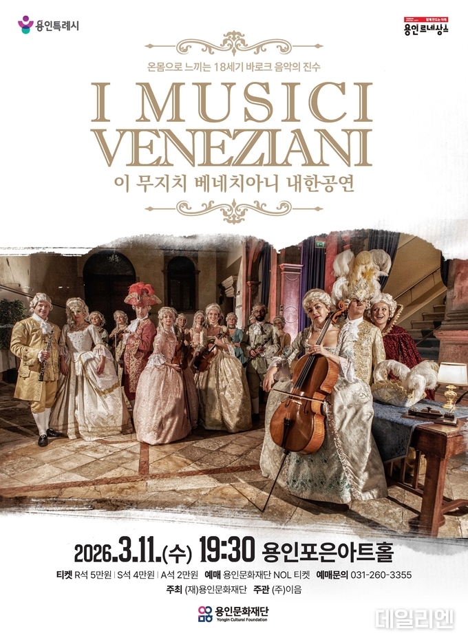 [데일리엔뉴스 이종성 기자] 용인문화재단은 세계적인 바로크 앙상블 ‘이 무지치 베네치아니(I Musici Veneziani)’ 내한 공연을 오는 3월 11일 용인포은아트홀에서 개최한다.