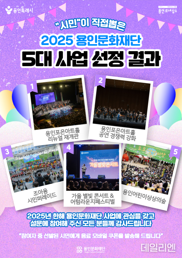 [데일리엔뉴스 이종성 기자] 용인문화재단은 시민 참여 온라인 투표를 통해 ‘시민이 선정한 2025년 용인문화재단 5대 대표 사업’을 확정해 발표했다.