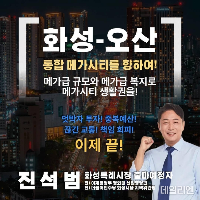 [데일리엔뉴스 이종성 기자] 진석범 화성특례시장 출마예정자가 화성특례시와 오산시의 행정 통합을 통한 ‘메가시티’ 구상을 공식 제안했다.