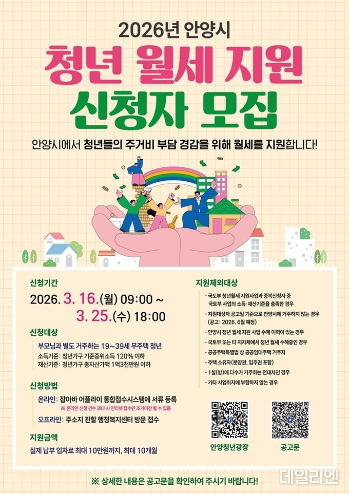 청년 월세 지원과 관련한 세부 내용은 안양시 홈페이지 고시공고란과 안양청년광장 홈페이지에서 확인할 수 있다.