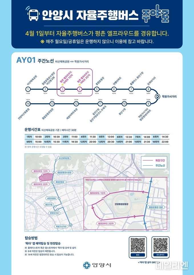 한편, 안양시 자율주행 버스 ‘주야로’는 심야 시간대 교통 편의를 위해 야간 노선도 운영 중이다.