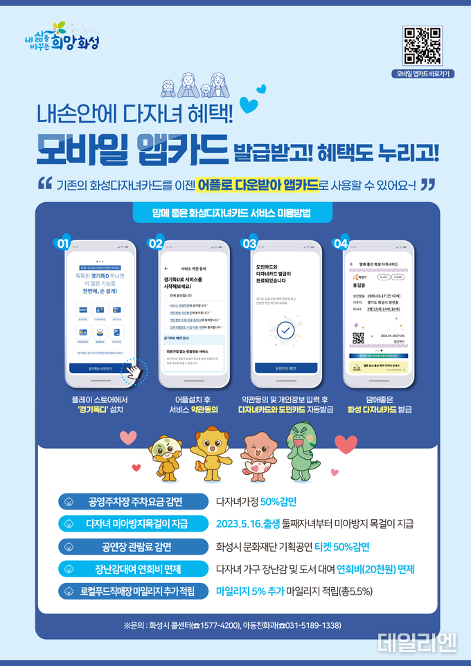 [데일리엔뉴스 유석주 기자] 화성시(시장 정명근)가 6일 기존 플라스틱 카드로 발급되던 다자녀카드를 모바일 앱 카드로도 발급한다고 밝혔다.