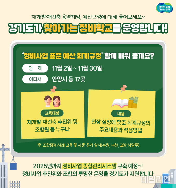 [데일리엔뉴스 이종성 기자] 경기도가 11월 2일부터 30일까지 안양시 등 17곳에서 재개발‧재건축 조합을 대상으로 관련 회계규정 등을 교육하는 ‘찾아가는 정비학교’를 운영한다.