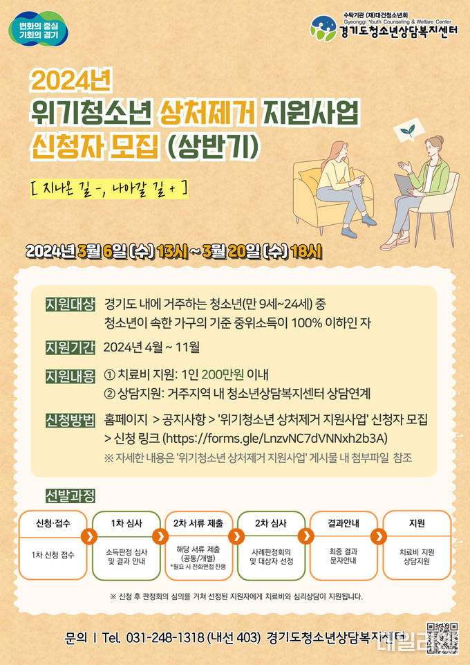 사업은 연중 상·하반기로 나누어 진행되며, 상반기 신청 기간은 3월 6일부터 3월 20일까지, 하반기 신청 기간은 6월 중으로 예정돼 있다. 경기도청소년상담복지센터 누리집을 통해 신청할 수 있다.