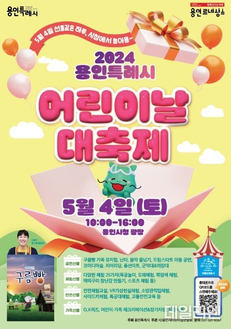 [데일리엔뉴스 이승준 기자] 용인특례시는 5월 4일 시청 하늘광장에서 ‘2024년 용인특례시 어린이날 대축제’를 개최한다고 25일 밝혔다.