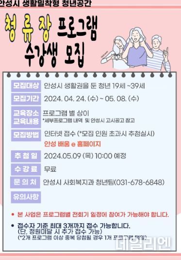 [데일리엔뉴스 이승준 기자] 안성시는 2024년 생활밀착형 청년공간-『청류장』프로그램 1기 수강생을 모집한다.