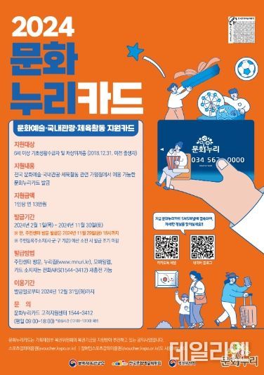 문화누리카드는 각 동 행정복지센터, 인터넷 누리집, 모바일 앱 등을 통해 오는 11월 30일까지 선착순 발급되며, 12월 31일까지 사용하지 않으면 자동 소멸한다.