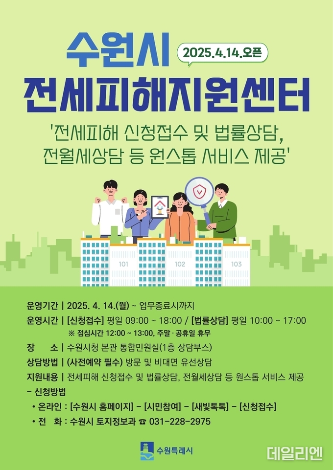 [데일리엔뉴스 이종성 기자] 수원시가 전세사기 피해자 지원 강화를 위해 ‘전세피해지원센터’를 시청 본관 1층 통합민원실에 정식 운영한다. 기존 전월세상담센터를 확대 개편한 센터는 피해 접수부터 법률상담, 행정절차 안내까지 통합 서비스를 제공한다.