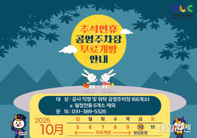 [데일리엔뉴스 이종성 기자] 안양시가 추석 명절을 맞아 10월 5일부터 9일까지 관내 유료 공영주차장 66곳을 무료 개방한다.
