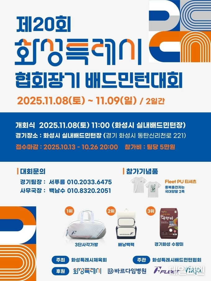 [데일리엔뉴스 이종성 기자] '제20회 화성특례시 협회장기 배드민턴대회'가 오는 11월 8일부터 9일까지 이틀간 화성시실내배드민턴장에서 개최된다.