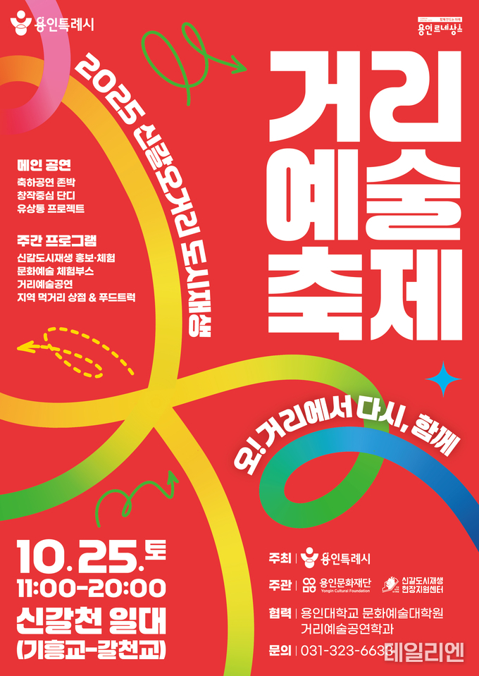 [데일리엔뉴스 이승준 기자] 용인특례시(시장 이상일)는 오는 25일 신갈오거리 신갈천 일대에서 ‘2025 신갈오거리 도시재생 거리예술축제–오! 거리에서 다시, 함께’를 개최한다고 14일 밝혔다.