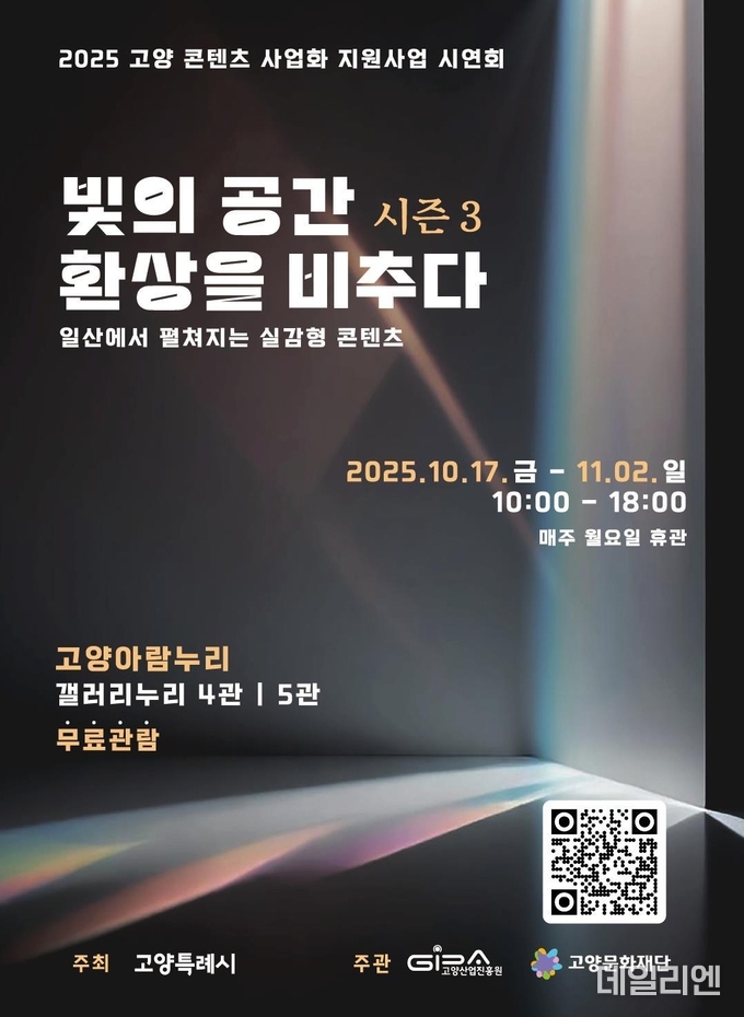 시는 17일부터 11월 2일까지 고양시립 아람미술관 갤러리누리에서 ‘빛의 공간 환상을 비추다 시즌3’ 전시를 열고, VR·AR·MR·XR 등 첨단 실감형 콘텐츠 5종을 시민들에게 공개한다.