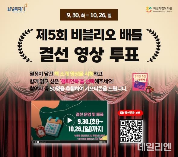 [데일리엔뉴스 이종성 기자] 화성시문화관광재단(대표이사 안필연)은 오는 10월 26일까지 ‘제5회 비블리오 배틀’ 결선 영상투표를 진행한다고 17일 밝혔다.