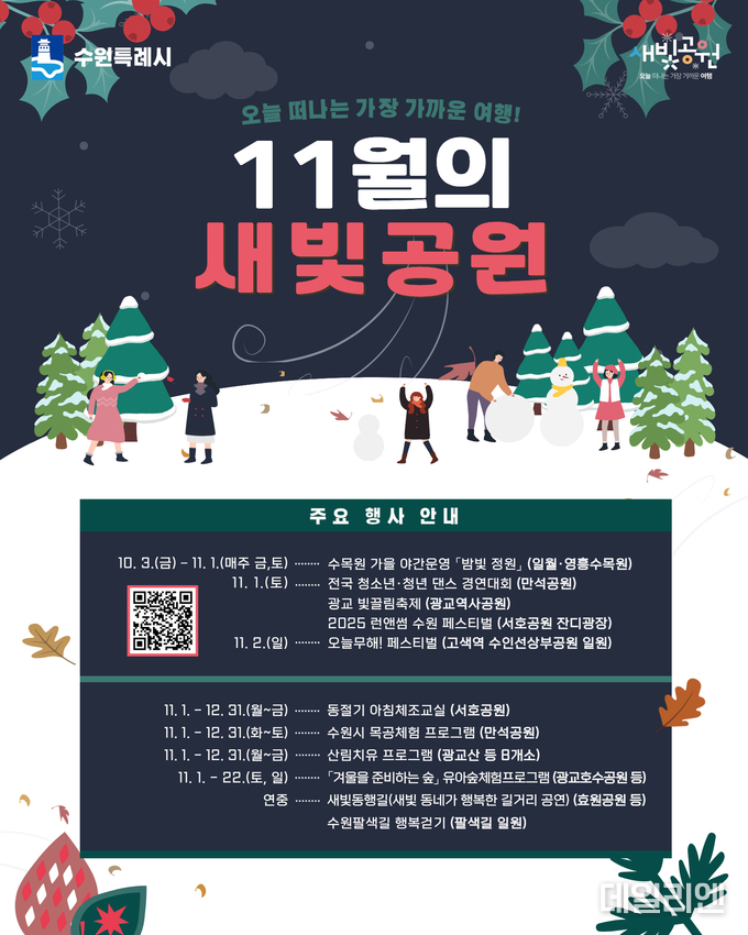 시는 11월 1일 ▲전국 청소년·청년 댄스경연대회(만석공원) ▲광교빛끌림축제(광교역사공원) ▲2025 런앤썸 수원 페스티벌(서호공원 잔디광장) 등 대규모 행사를 연다.