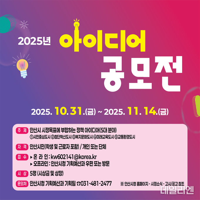 [데일리엔뉴스 이종성 기자] 안산시(시장 이민근)는 오는 11월 14일까지 시민의 창의적인 의견을 시정에 반영하기 위한 ‘2025년 시민 아이디어 공모전’을 개최한다고 1일 밝혔다.