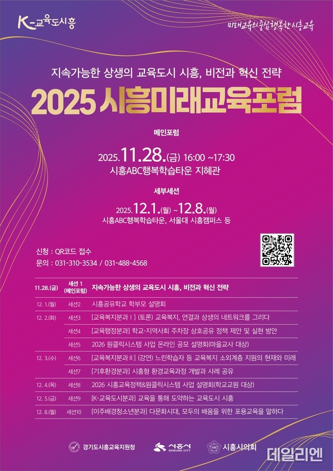 [데일리엔뉴스 이종성 기자] 시흥시(시장 임병택)와 시흥교육지원청(교육장 채열희), 시흥시의회(의장 오인열)가 오는 11월 28일부터 12월 8일까지 ‘2025 시흥미래교육포럼’을 공동 개최한다.