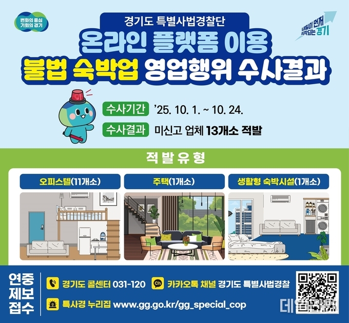기이도 경기도 특별사법경찰단장은 “온라인 플랫폼을 악용한 불법 숙박업은 안전과 위생의 사각지대를 만들고 있다”며 “도민의 생명과 직결되는 사안인 만큼 불법행위에는 단호히 대응하겠다”고 말했다.