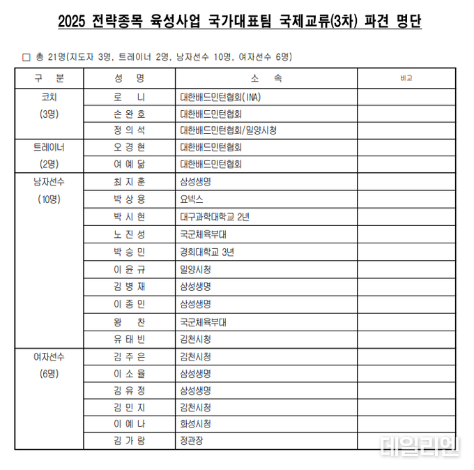 [데일리엔뉴스 이종성 기자] 대한배드민턴협회가 ‘2025 전략종목 육성사업’의 일환으로 오는 11월 스코틀랜드 국가대표팀과 국제교류 프로그램을 추진한다. 협회는 이번 교류를 통해 대표팀의 경기력 강화와 국제 경쟁력 제고에 나선다.