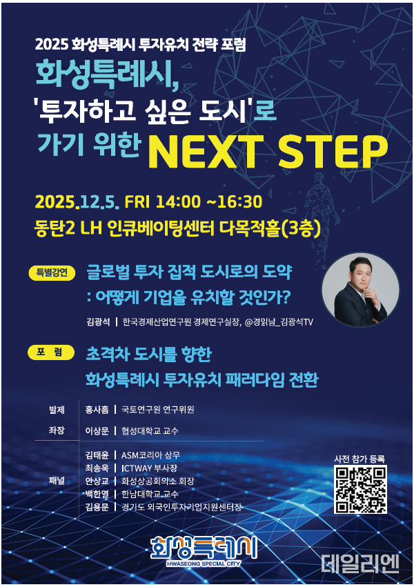 [데일리엔뉴스 유석주 기자] 화성특례시가 지속가능한 투자도시로의 도약을 위해 ‘2025 화성특례시 투자유치 전략 포럼’을 다음 달 5일 동탄2 인큐베이팅센터에서 개최한다. 시가 투자유치 전략을 주제로 단독 포럼을 여는 것은 이번이 처음이다.