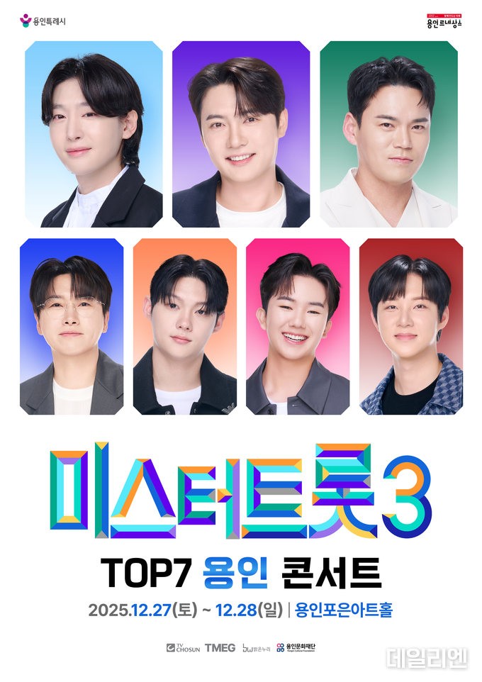 [데일리엔뉴스 이종성 기자] 용인문화재단은 미스터트롯3 톱7 콘서트가 오는 12월 27일부터 28일까지 용인포은아트홀에서 열린다고 21일 밝혔다. 공연은 첫날 오후 1시와 6시, 이튿날 오후 1시 등 총 3회 진행된다.